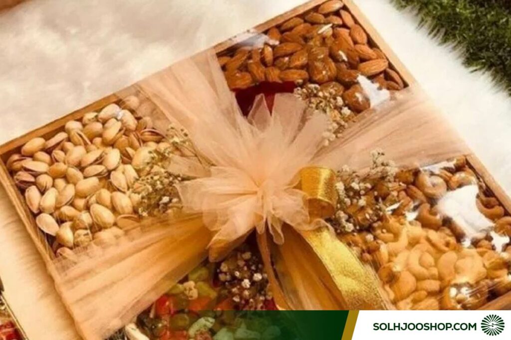 استفاده از تور و روبانهای مخملی، شاخههای کوچک کاج یا دانههای انار مصنوعی در کنار ظرف، تم یلدایی و لوکس بودن هدیه را دوچندان میکند.